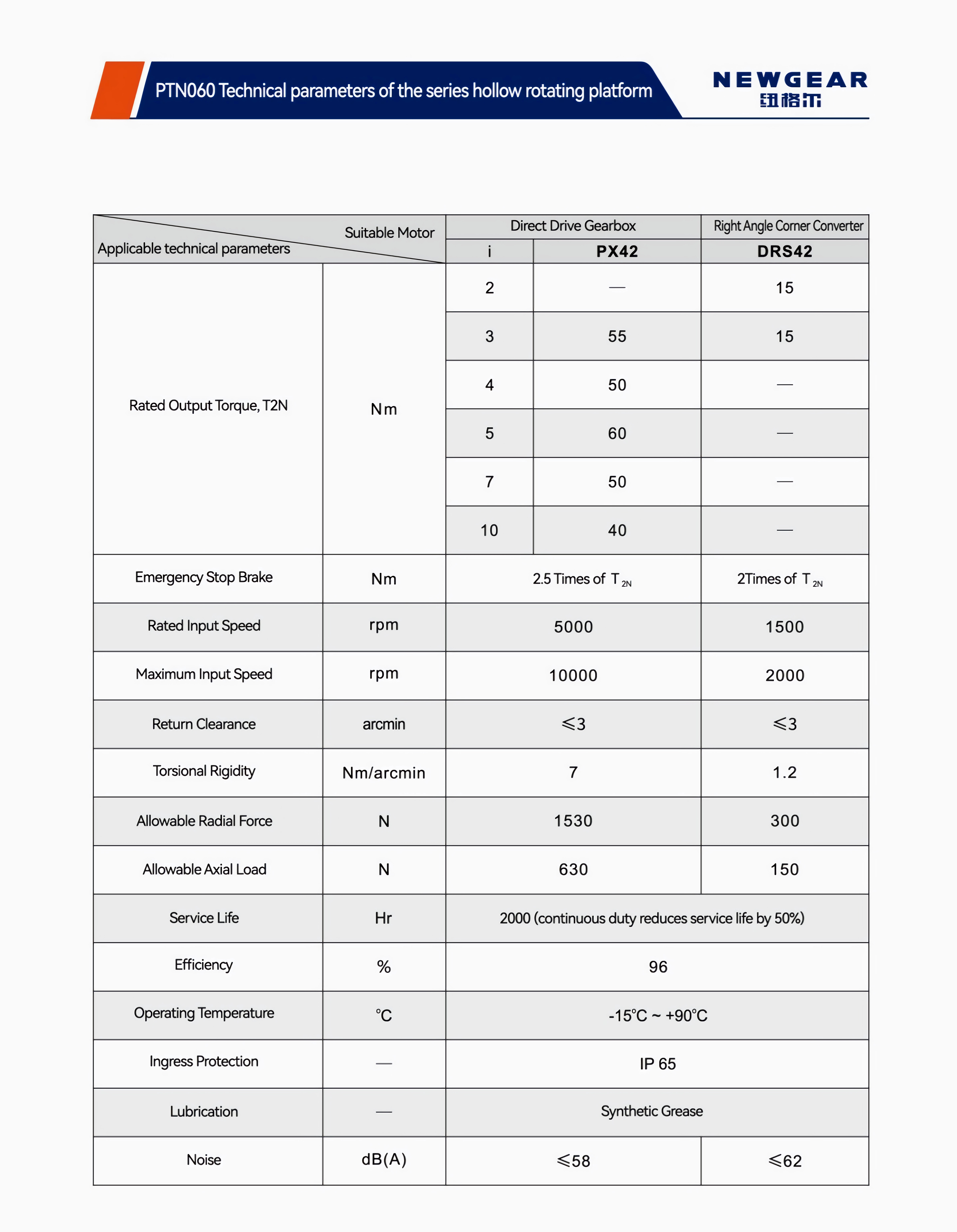 PTN060, orta ila düşük torklu otomasyon uygulamaları için tasarlanmış, içi boş döner tabla serimizdeki uygun fiyatlı bir modeldir. NEMA 17 step motorlar ve 50W/100W AC servo motorlarla uyumludur ve 5:1 veya 10:1 dişli oranları sunar. ≤1 ark-dakika boşluk ve ±15 ark-saniye tekrarlanabilirlik özelliğiyle hassas indeksleme ve konumlandırma sağlar. Platformun temel avantajlarını miras alan bu model, kolay kablolama ve sağlam performans için delikli tasarım ve yüksek rijitlikte çapraz rulmanlar içerir. Standart IP40 koruma derecesiyle, yaygın endüstriyel ortamlar için uygundur. Ayrıca, mevcut hız ve tork aralıklarını genişletmek için PX42 planet dişli kutularımızla sorunsuz bir şekilde birleştirilebilir ve ekipmanınız için kompakt ve verimli bir döner çözüm sunar.